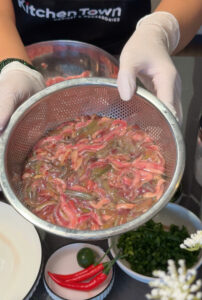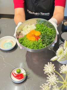 Cho thịt nạc vai, trứng gà, hành khô băm, hành lá, thì là, gừng, ớt và vỏ quýt thái thật nhỏ vào bát rươi. Nêm gia vị, mì chính, hạt tiêu vừa ăn, trộn đều.