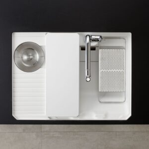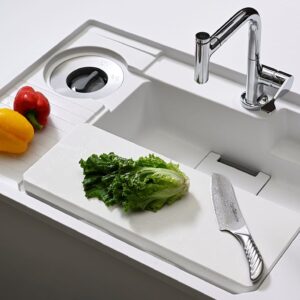 Kích thước 820mm x 622mm phù hợp lắp đặt trên mặt đá bếp có chiều rộng tối thiểu 650mm. Chậu rửa chén thông minh và đa năng, thân thiện với người dùng, với đáy mở giúp ngồi thao tác nấu nướng một cách thoải mái trong thời gian dài. Thớt đi kèm nhẹ, linh hoạt đặt dọc hoặc ngang, tận dụng chậu như mặt bàn phụ. Vỉ đa năng đặt ở gờ dưới chậu, tối ưu không gian linh hoạt. Đặc biệt, bên trái chậu có thể lắp máy hủy rác hoặc nắp đậy rổ đựng rác, tùy theo nhu cầu sử dụng.