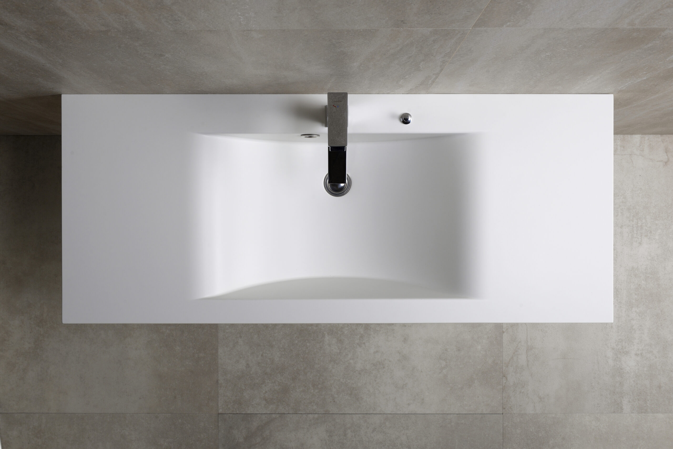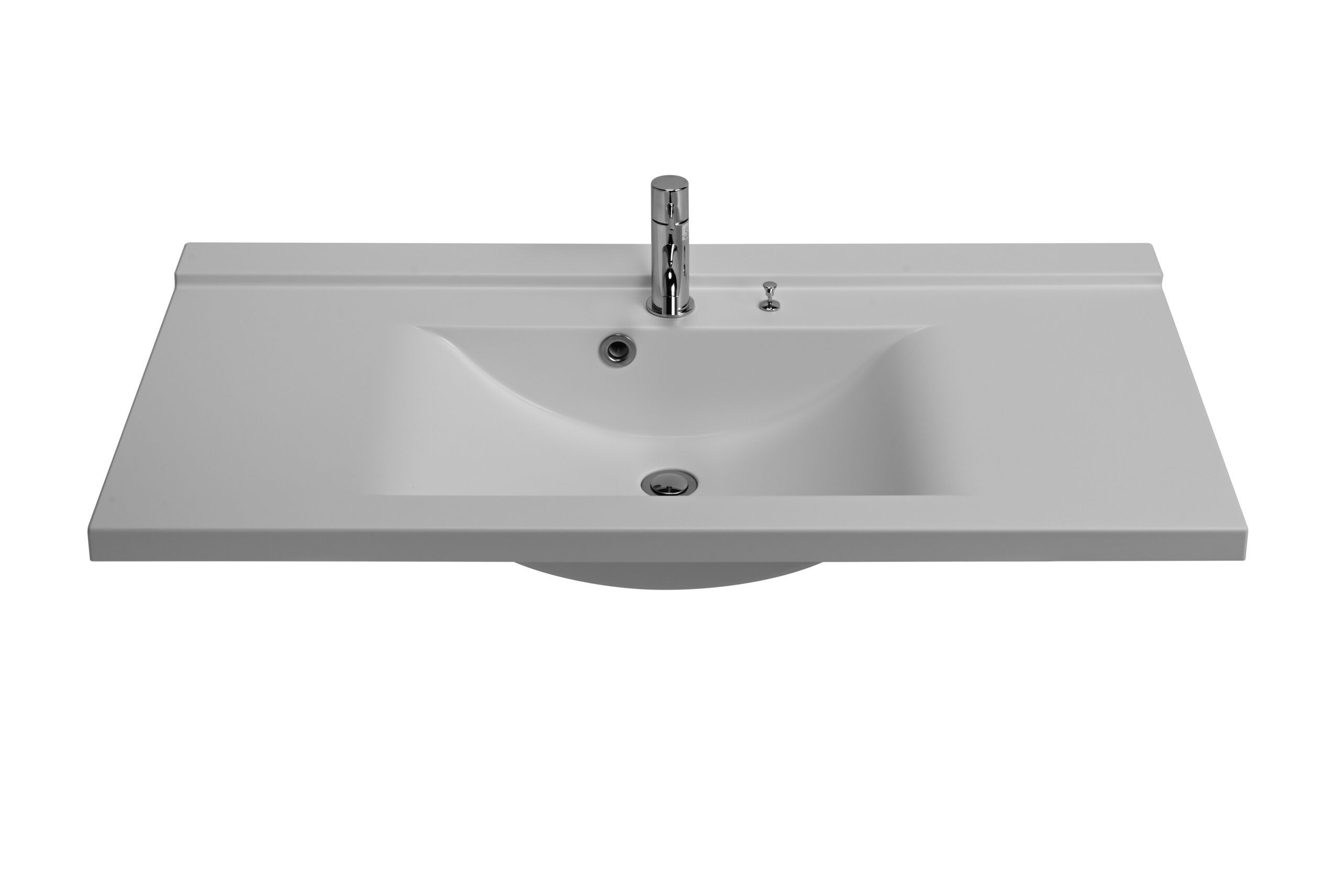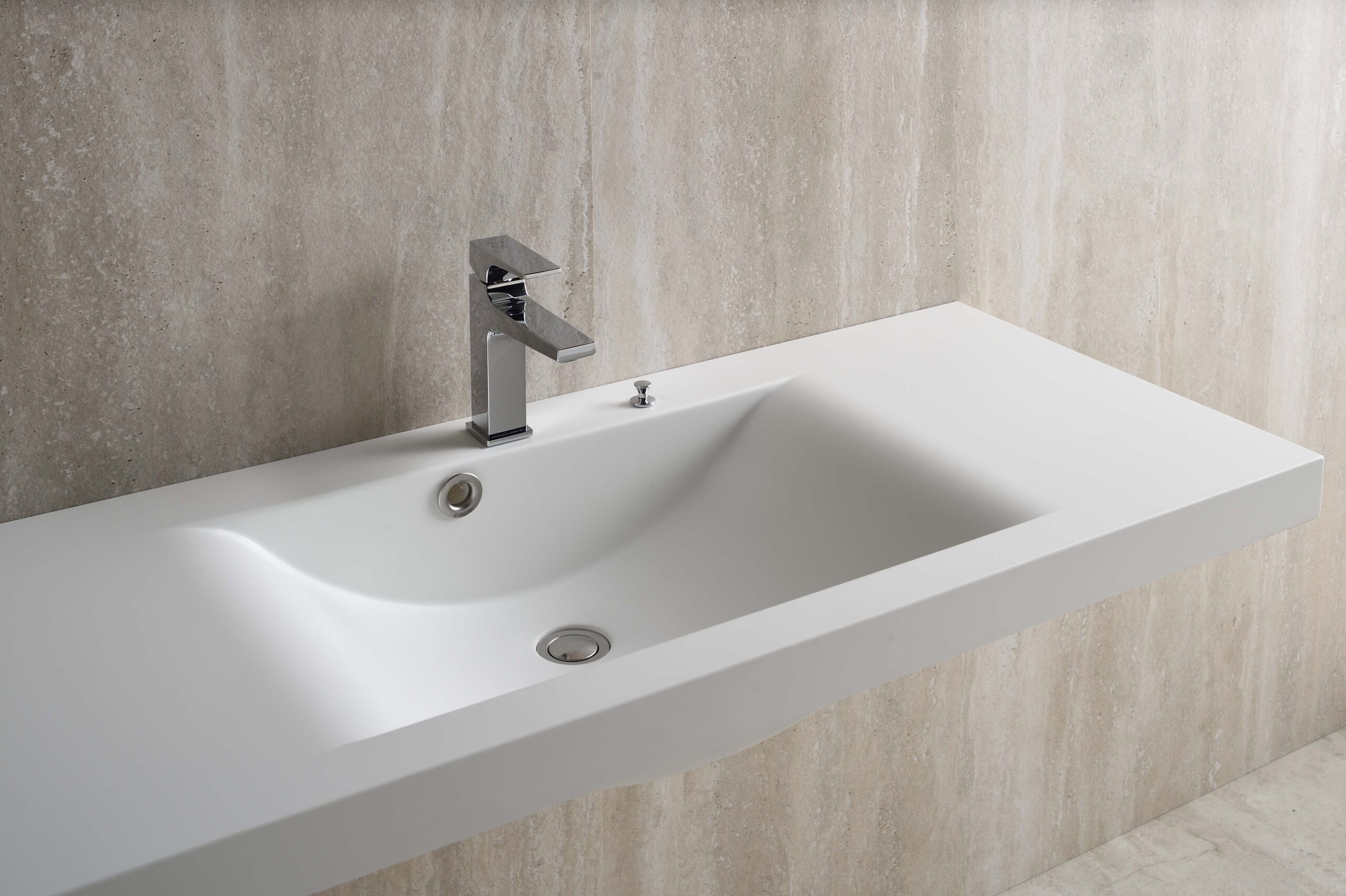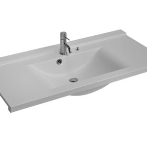 Chậu liền khối sau khi ép có chiều dài tối đa 1900mm. Tùy theo kích thước yêu cầu, chậu sẽ được gia công thứ cấp tùy chỉnh chiều dài trong khoảng 750mm~1900mm, vị trí phần chậu chính tâm hoặc lệch tâm. Sản phẩm được trang bị gờ chống tràn phía sau, cùng nút vặn pop-up giúp dễ dàng xả hoặc giữ nước mà không cần chạm tay trực tiếp, đảm bảo vệ sinh và tiện dụng.