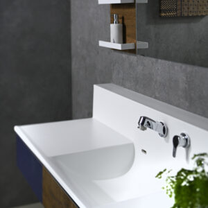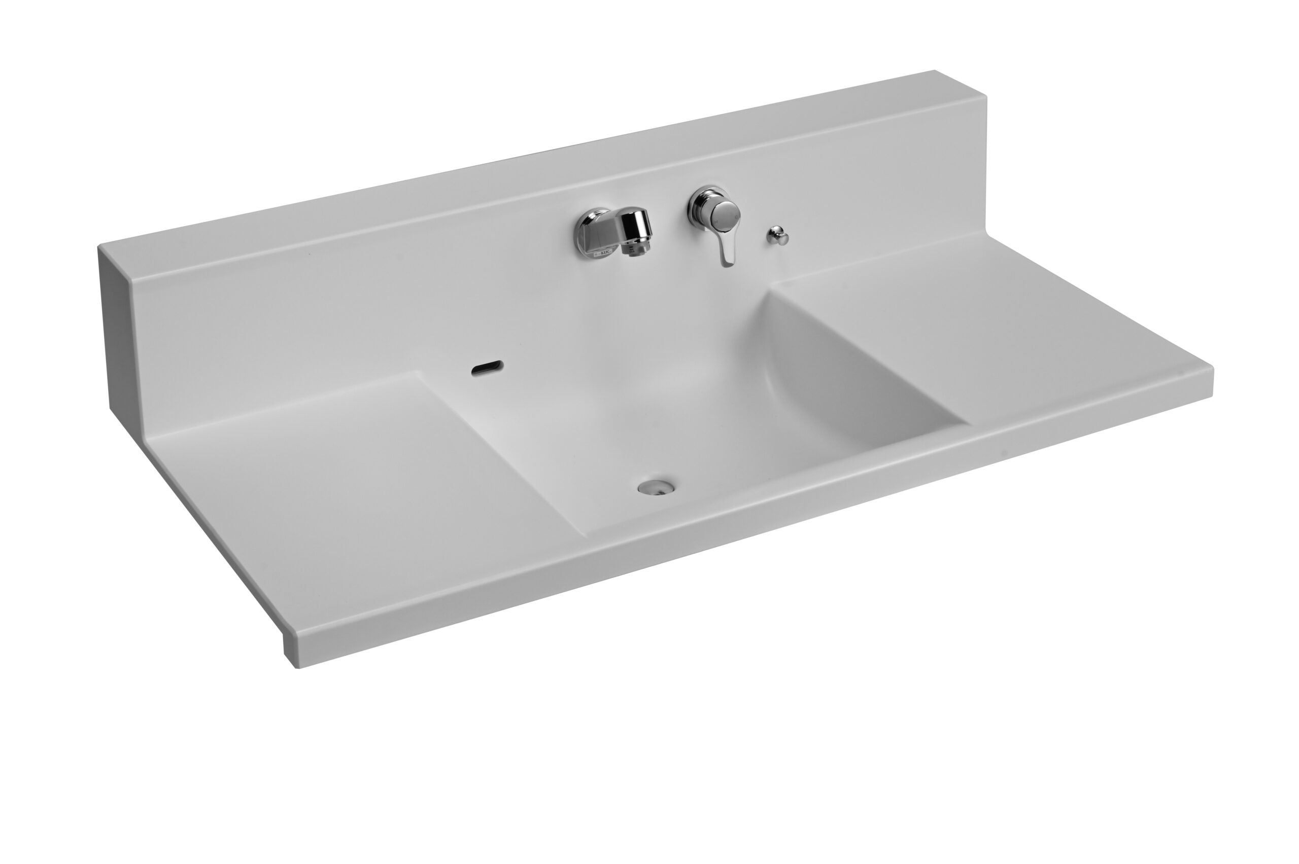 Phần trên của lưng chậu được thiết kế sâu 120mm, tạo thêm không gian để đặt các vật dụng nhỏ một cách thuận tiện và khô giáo. Vòi nước đi tường được lắp ở phần lưng cao giúp ngăn nước bắn lên tường, tăng tính vệ sinh quanh khu vực vòi. Chậu còn được trang bị cổ xả thải không sử dụng mặt bích kim loại để chống rỉ sét, và nút pop-up giúp xả hoặc giữ nước một cách dễ dàng mà không cần tiếp xúc trực tiếp, đảm bảo vệ sinh và tiện ích.