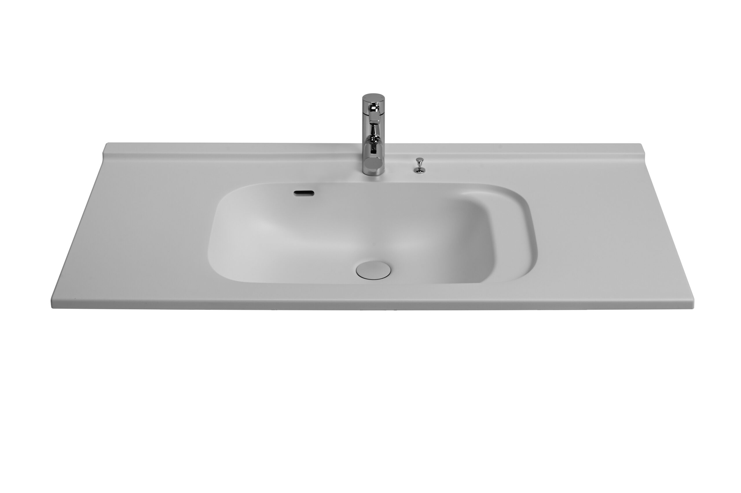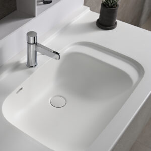 Chậu liền khối sau khi ép có chiều dài tối đa 1900mm. Tùy theo kích thước yêu cầu, chậu sẽ được gia công thứ cấp tùy chỉnh chiều dài trong khoảng 750mm~1900mm, vị trí phần chậu chính tâm hoặc lệch tâm. Chậu còn được trang bị cổ xả thải không sử dụng mặt bích kim loại để chống rỉ sét, và nút pop-up giúp xả hoặc giữ nước một cách dễ dàng mà không cần tiếp xúc trực tiếp, đảm bảo vệ sinh và tiện ích. Phần cánh giữa chậu và mặt đá được thiết kế để có thể đặt tạm thời các vật nhỏ bị ướt, tăng cường tính năng và tiện ích cho người sử dụng