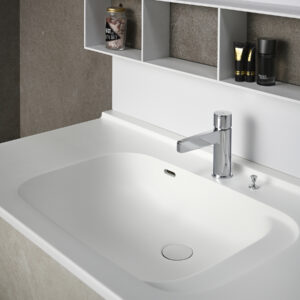 Chậu rửa mặt liền khối DA của thương hiệu Yoshimoto Global có phần chậu và phần mặt đá dài được ép liền thành một khối nhờ công nghệ ép hiện đại dưới nhiệt độ và áp suất cao. Bạn không cần mua mặt đá và chậu rửa rời rồi tốn công cắt mặt đá và gắn chậu âm bằng keo silicon. Công nghệ chậu liền khối này mang đến vẻ đẹp hoàn mỹ, chất lượng vượt trội và tiện ích tối đa cho không gian chậu rửa mặt.