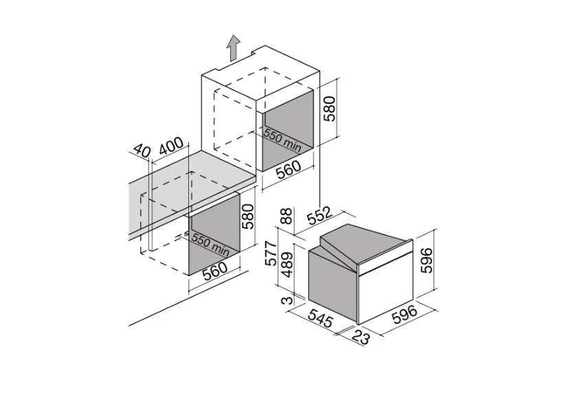 vệ sinh, cửa có thể tháo rời với kính phản nhiệt ba lớp, bản lề đóng mềm, quạt làm mát tangential, vỉ nướng gập xuống, 2 đèn bên trong, giá bên