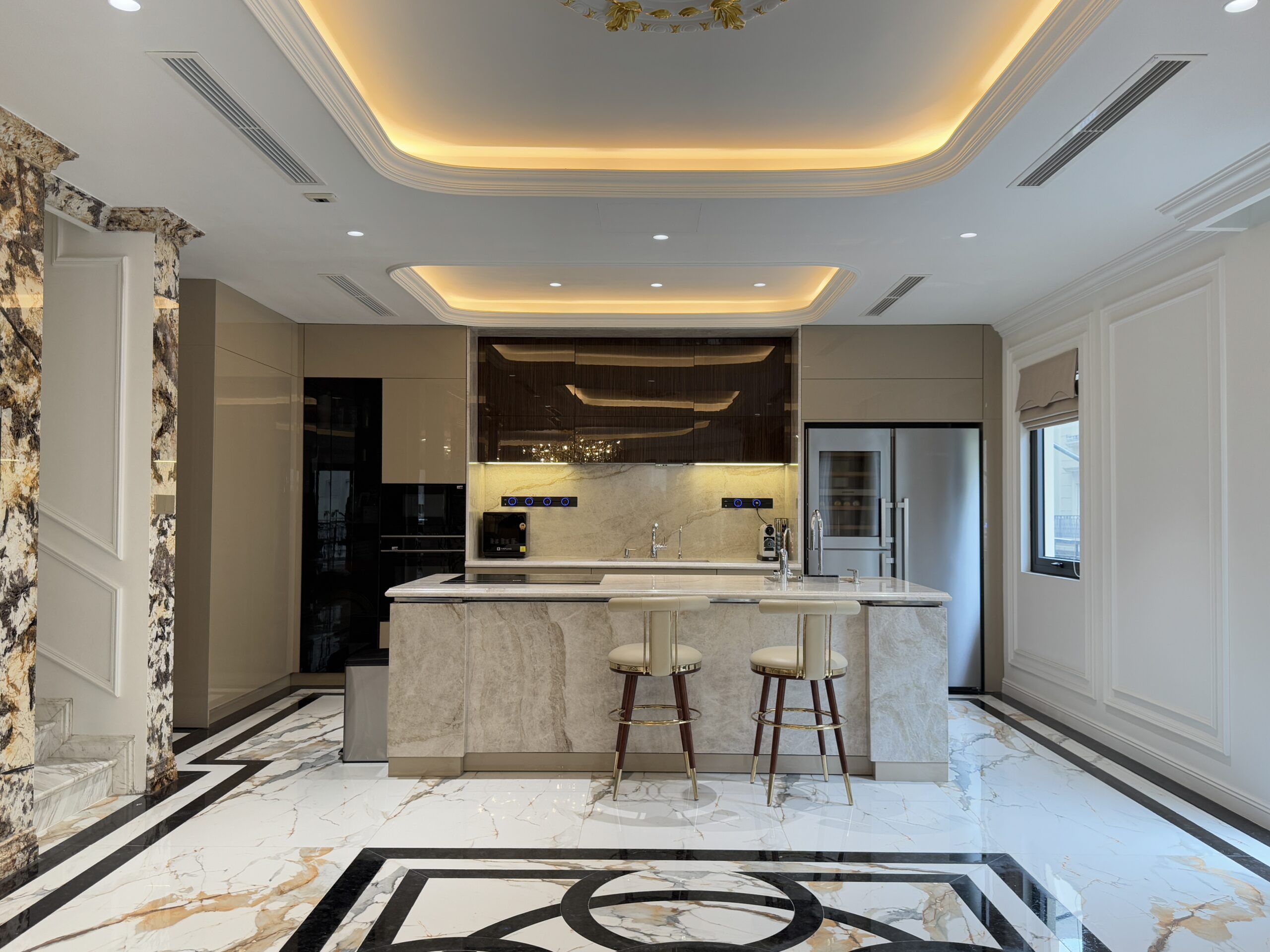 Bàn đảo trung tâm ốp đá toàn phần, vừa là khu vực sơ chế vừa kết hợp quầy bar/ăn sáng, đi kèm ghế bar chân kim loại mạ tinh tế.
