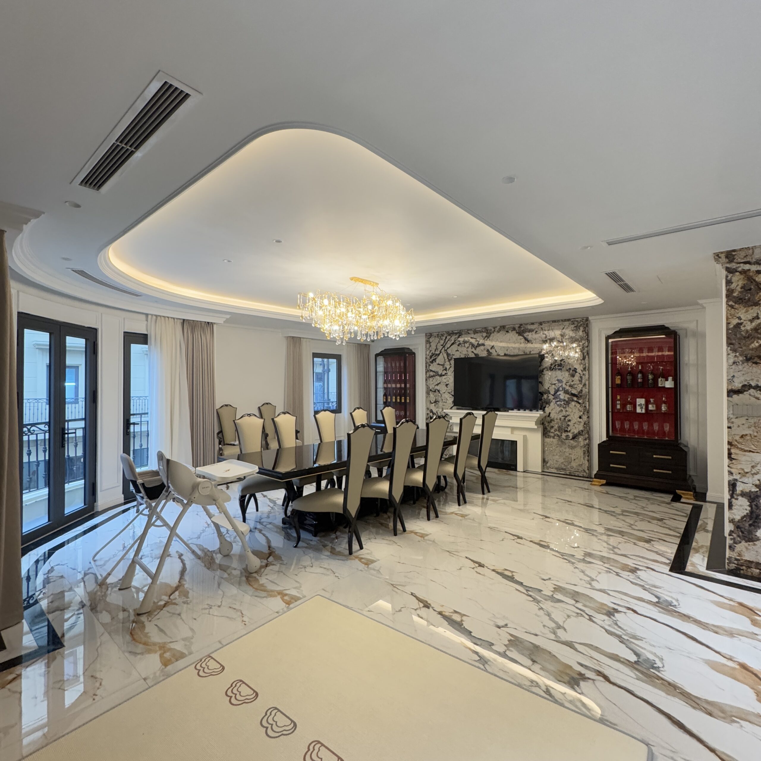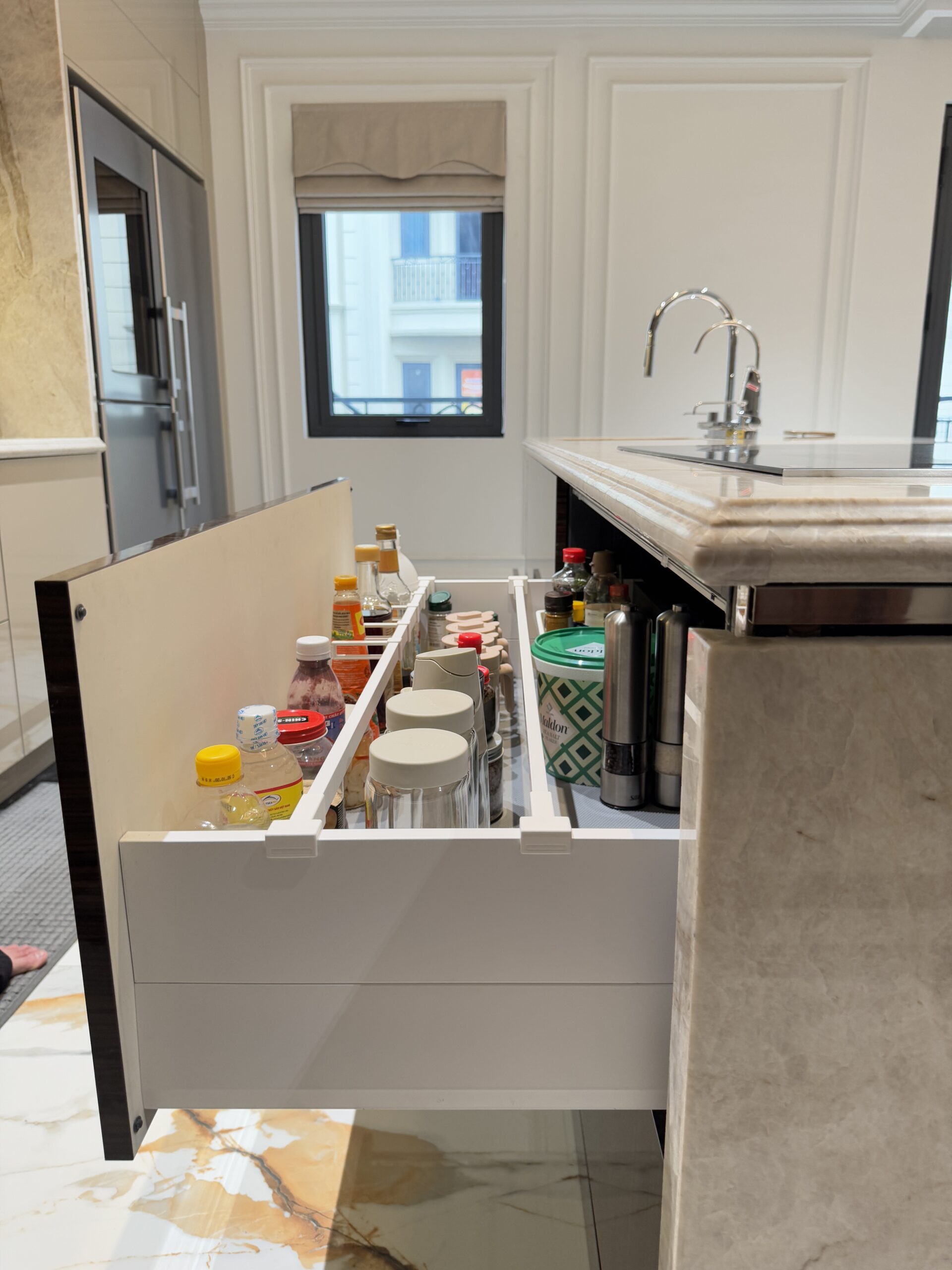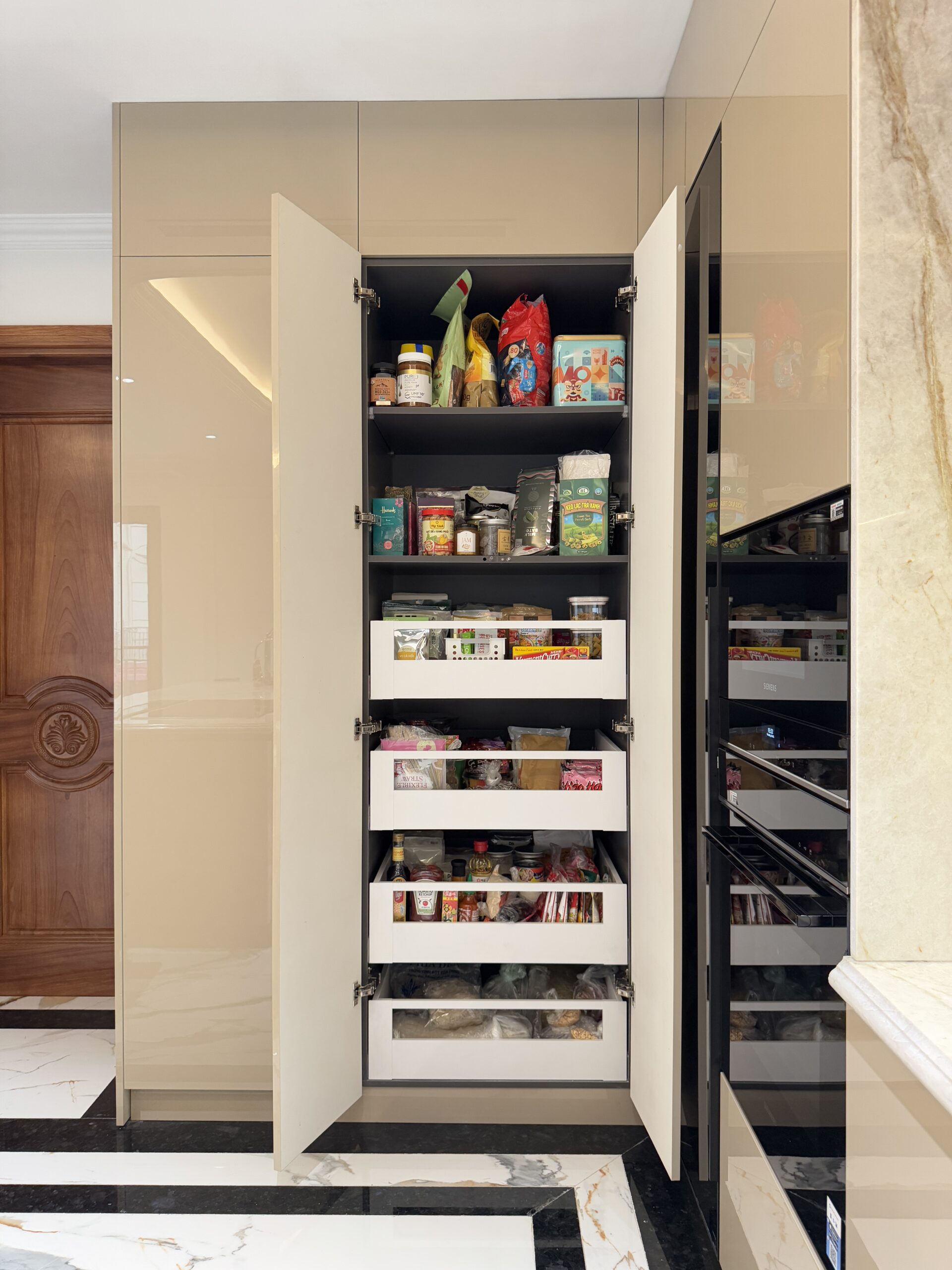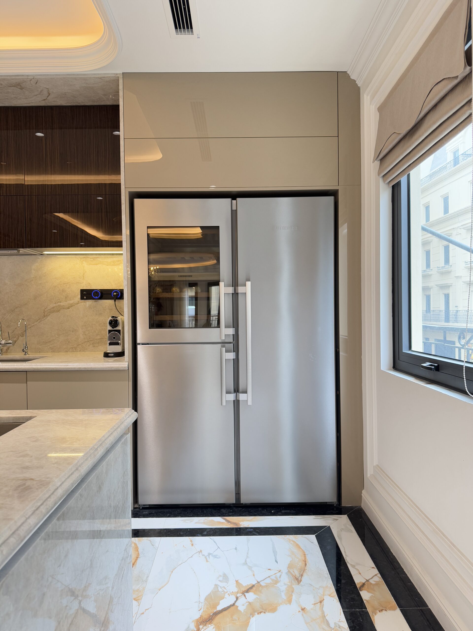Mặt bếp và vách ốp sử dụng đá marble vân mây tự nhiên, liền mạch, tăng tính thẩm mỹ và dễ vệ sinh. Thiết bị bếp âm tủ như lò nướng, lò vi sóng, tủ lạnh được bố trí gọn gàng, tạo tổng thể liền khối.