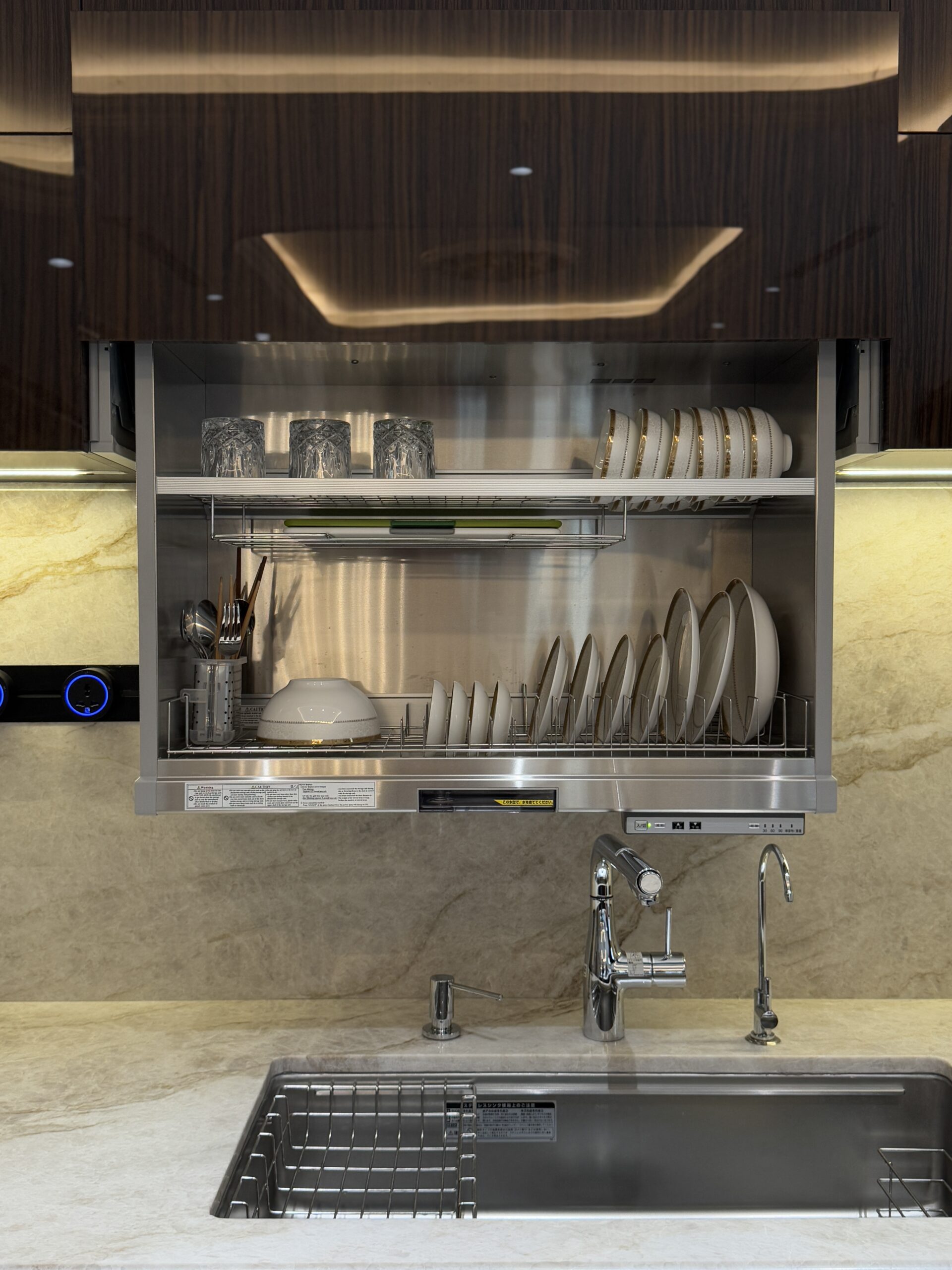 Hệ đèn LED hắt trần, hắt tủ ánh sáng vàng ấm giúp không gian bếp ấm cúng, sang trọng và tiện nghi.