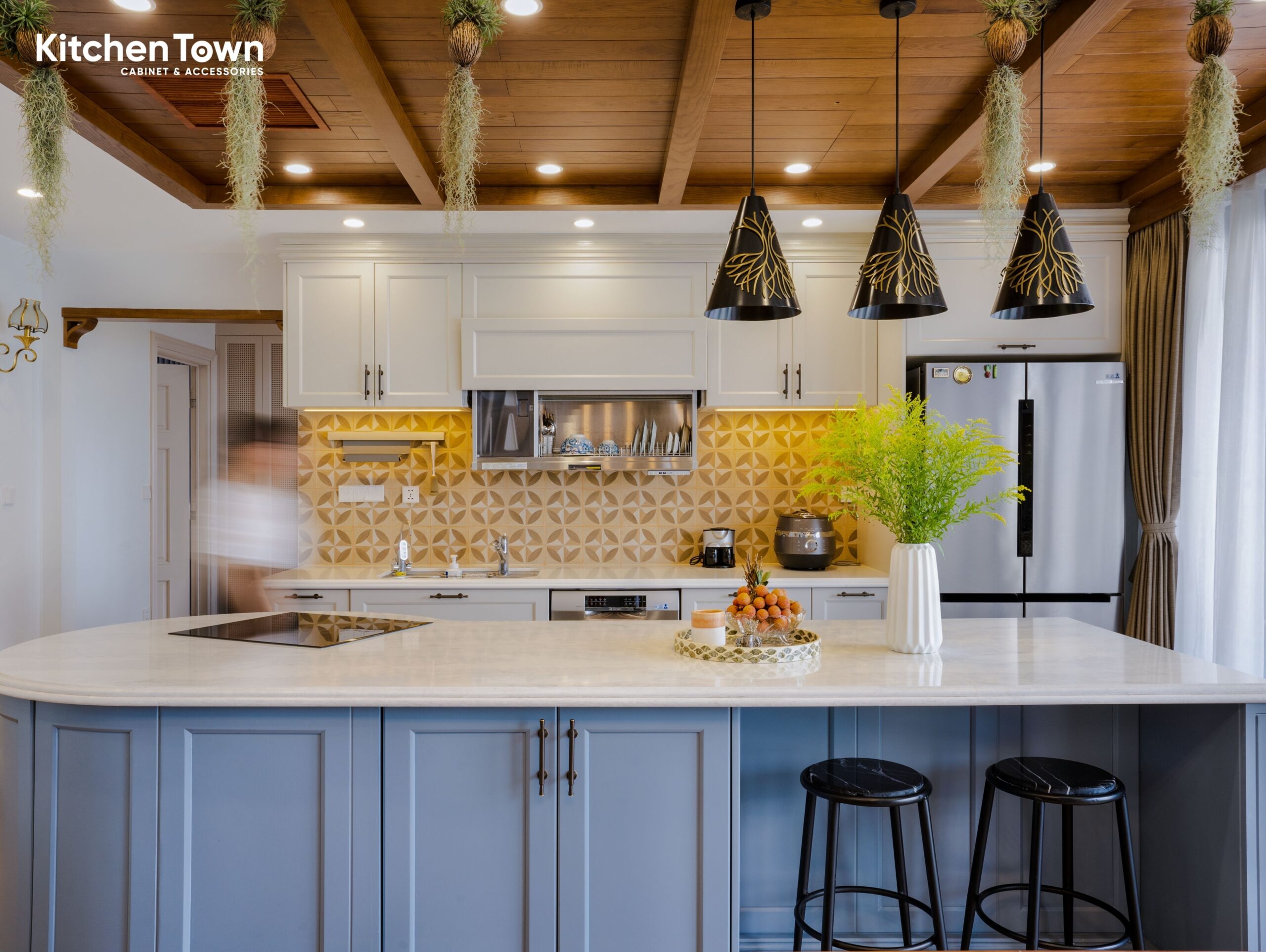 Sẽ thế nào khi kết hợp phong cách tân cổ điển và vẻ đẹp Địa Trung Hải vào trong một căn bếp? Bạn sẽ có được cảm giác như một ốc đảo xinh đẹp với sắc xanh dịu mát, cảm giác tươi sáng, nhẹ nhàng như thiết kế tủ bếp cao cấp này. Các đường nét thiết kế tủ được lấy cảm hứng từ phong cách Địa Trung Hải với tone màu Courtland Blue, vừa độc đáo, ấn tượng mà vẫn thanh lịch, dịu dàng. Điểm tạo nên sự nổi bật của thiết kế tủ bếp này chủ yếu là cách kết hợp màu sắc cùng với những chiếc đèn trần mộc mạc.