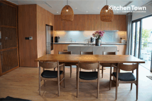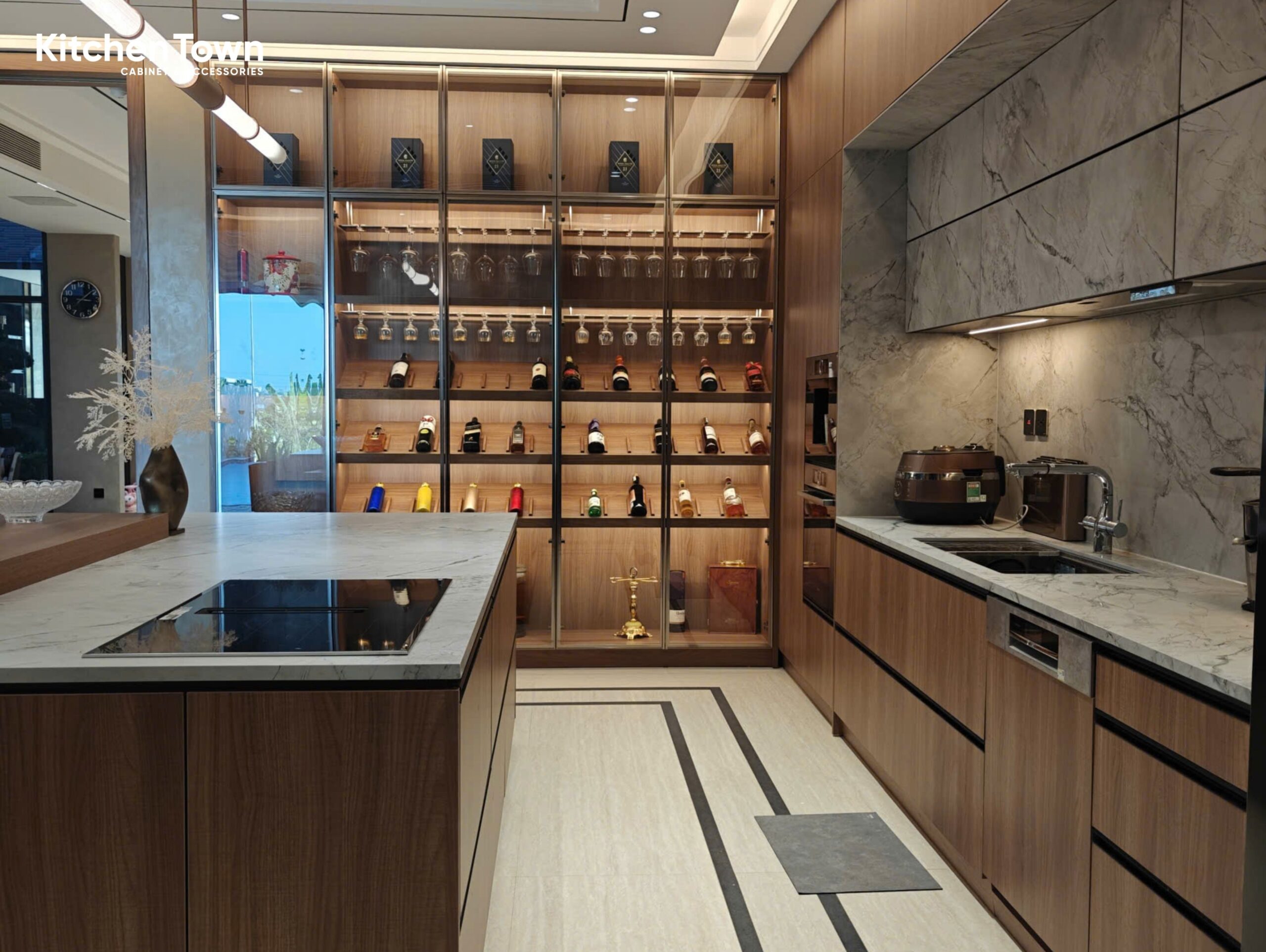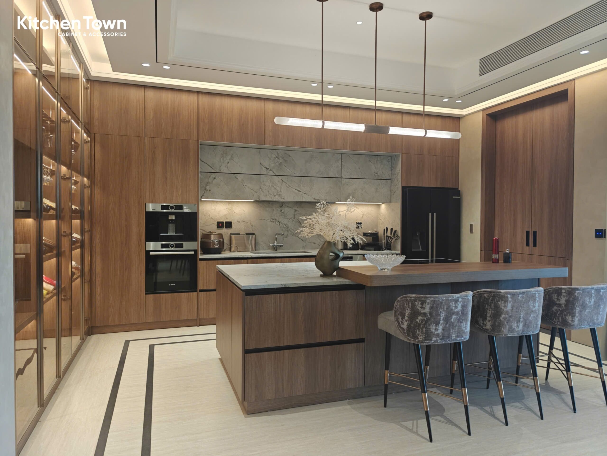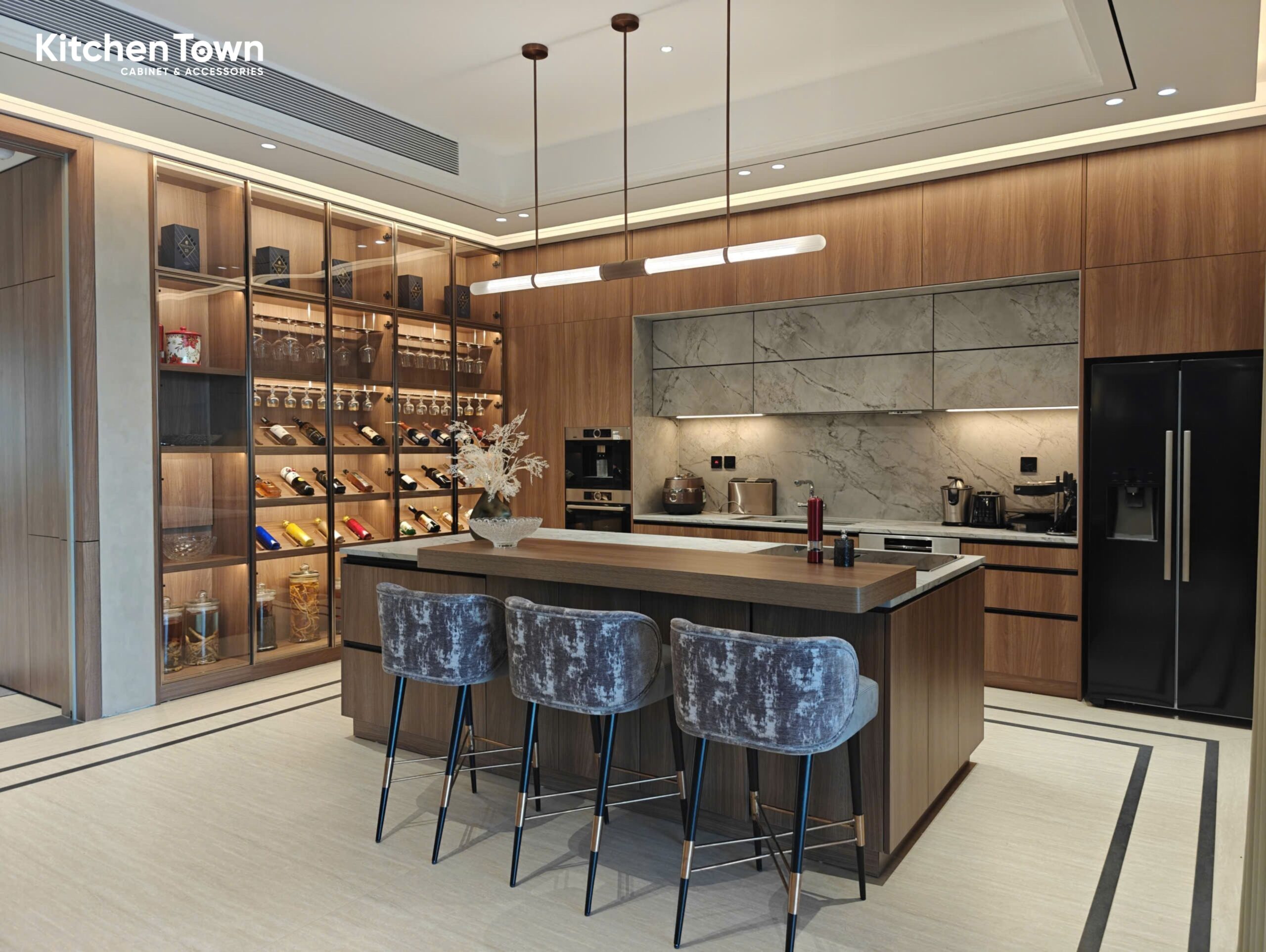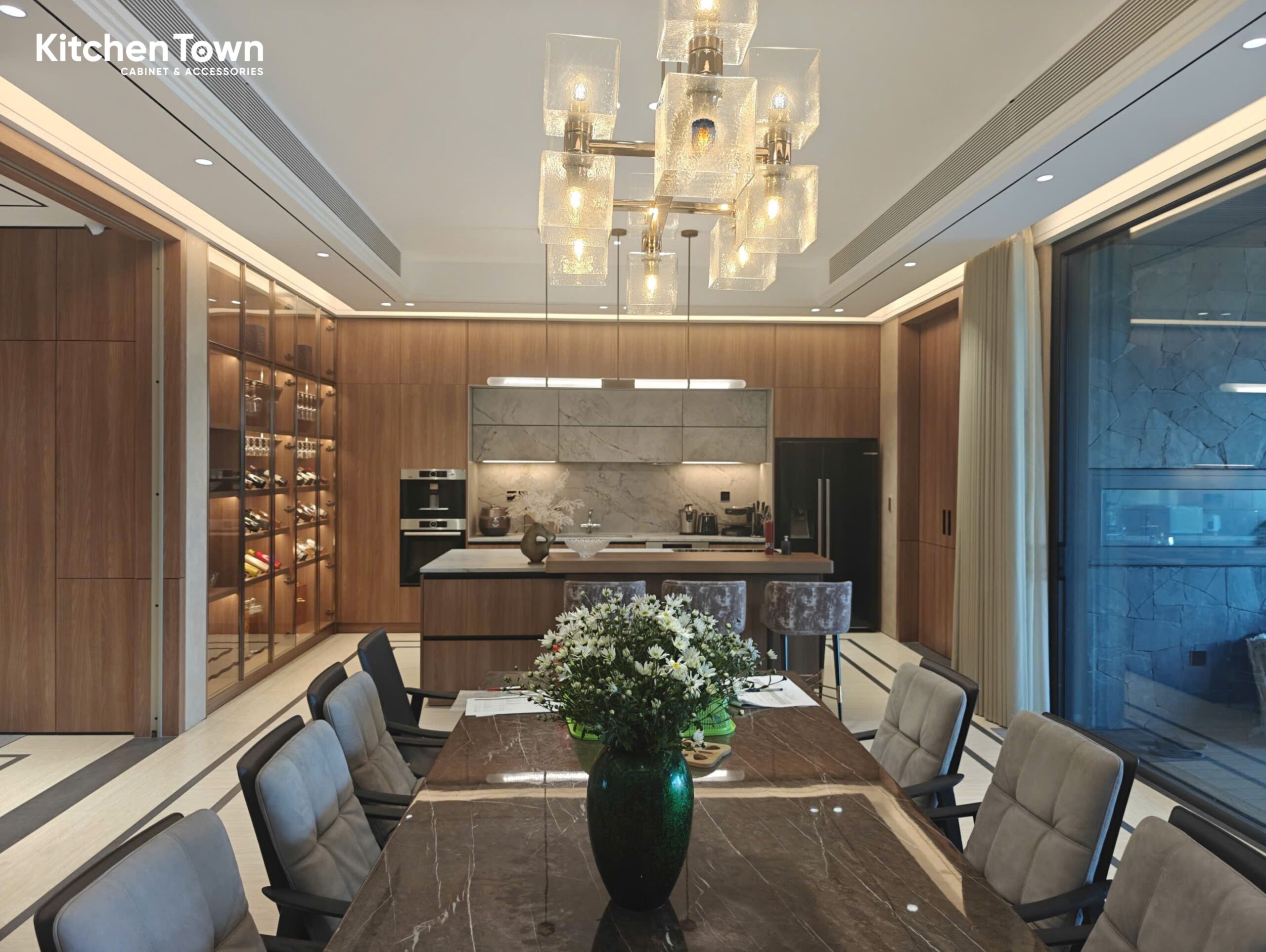 Tủ bếp có thiết kế chữ I kết hợp với bản đảo hiện đại và tiện dụng. Không gian bếp được trang trí sang trọng với các tủ gỗ và kệ lưu trữ tích hợp. Bản đảo là điểm nhấn chính, vừa tạo thêm không gian mặt bếp rộng rãi, vừa có thể làm khu vực ngồi với ghế bar. Các thiết bị hiện đại như lò nướng và tủ lạnh màu đen được tích hợp, hài hòa với các chi tiết gỗ và đá marble tạo nên vẻ đẹp tinh tế. Không gian được chiếu sáng bằng đèn âm trần, mang lại không khí ấm cúng, sang trọng, phù hợp cho việc nấu nướng và tiếp khách.