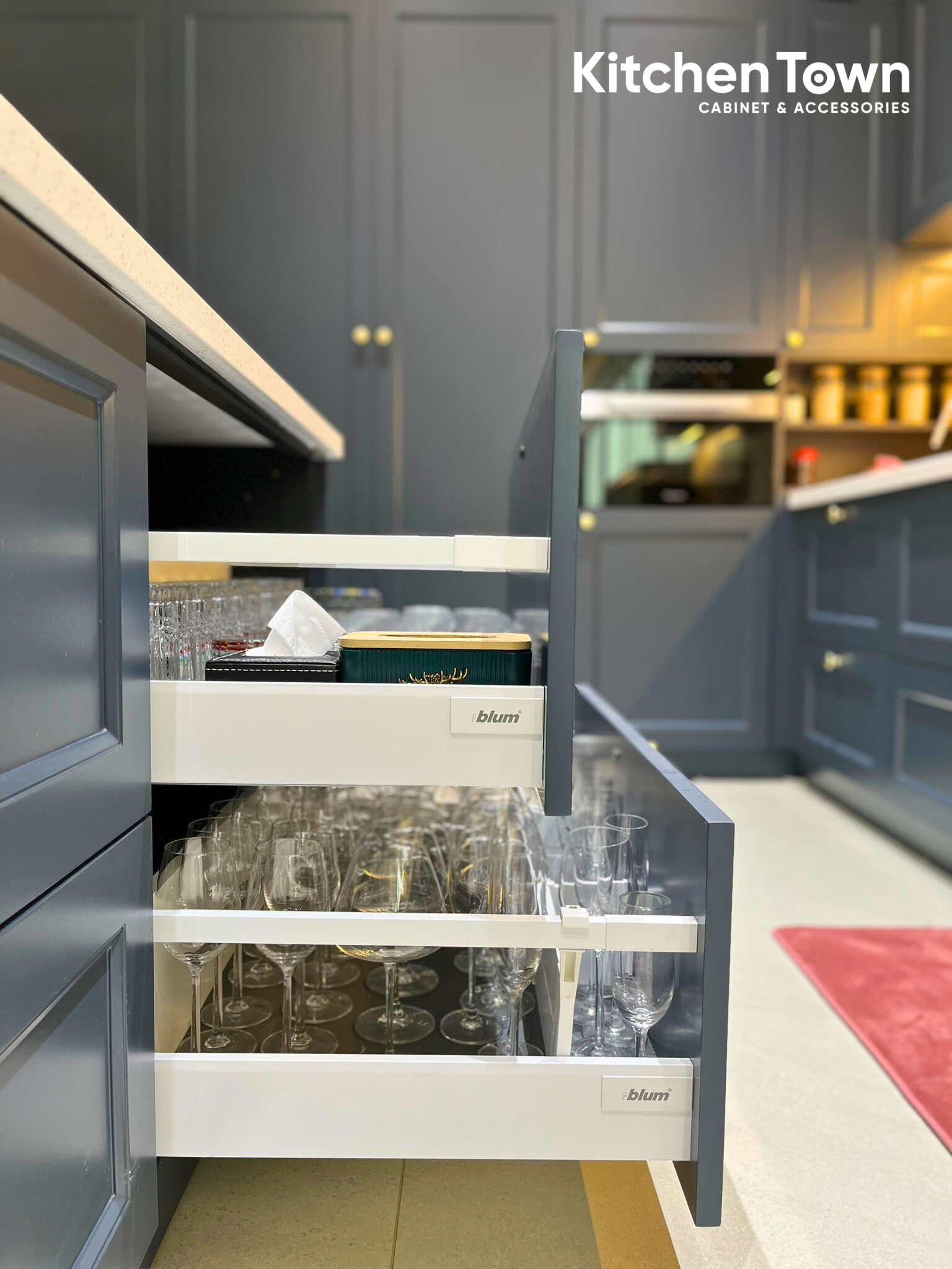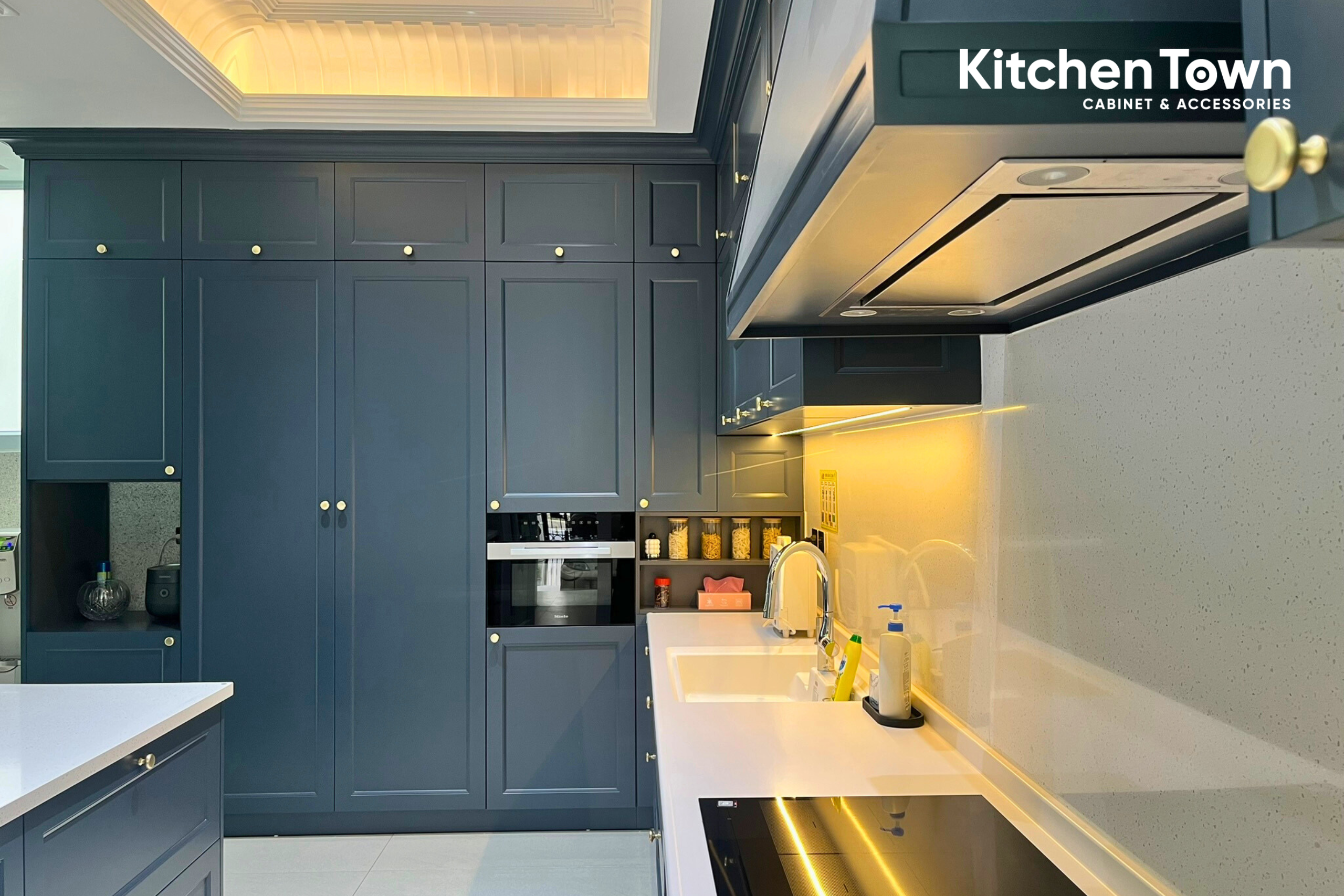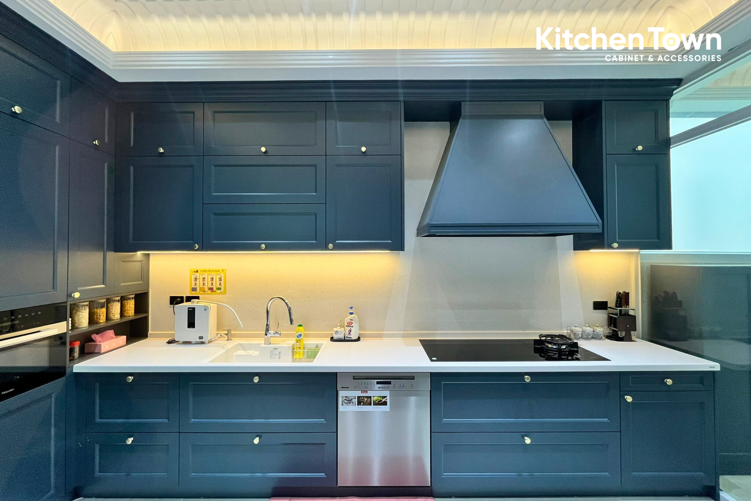 Không gian bếp được thiết kế theo dạng chữ L giúp tối ưu diện tích và luồng di chuyển. Tông xanh than/xám xanh cao cấp mang vẻ đẹp trầm ấm, hiện đại, kết hợp tay nắm kim loại mạ vàng tạo điểm nhấn sang trọng và đẳng cấp. Hệ tủ trên kịch trần tăng khả năng lưu trữ, đồng thời tạo cảm giác trần cao và gọn gàng.