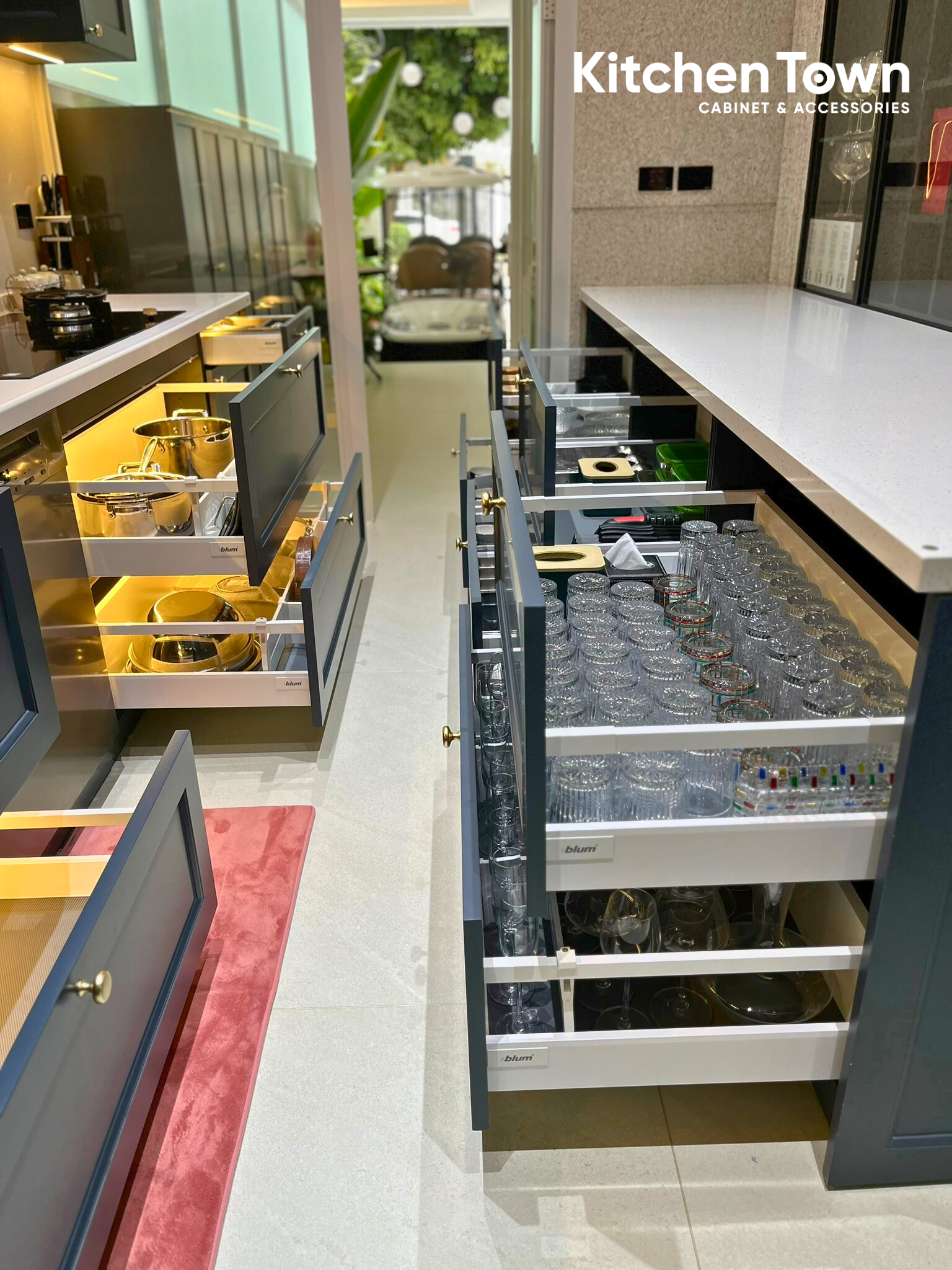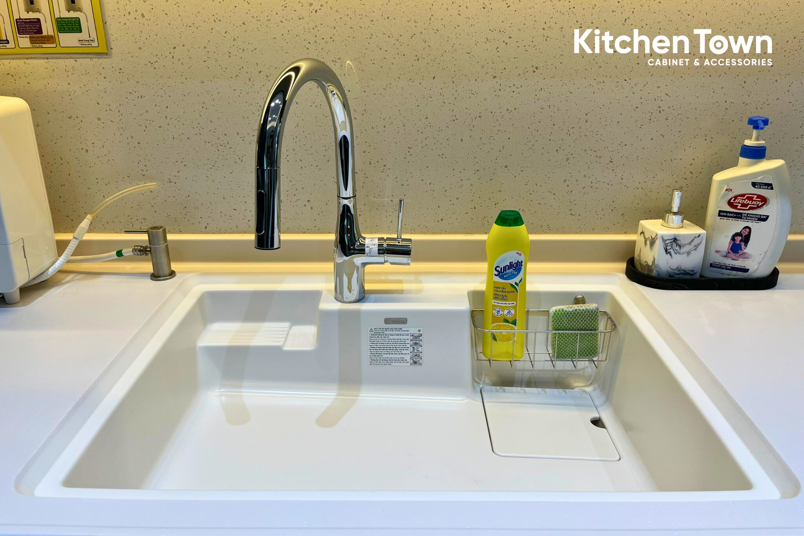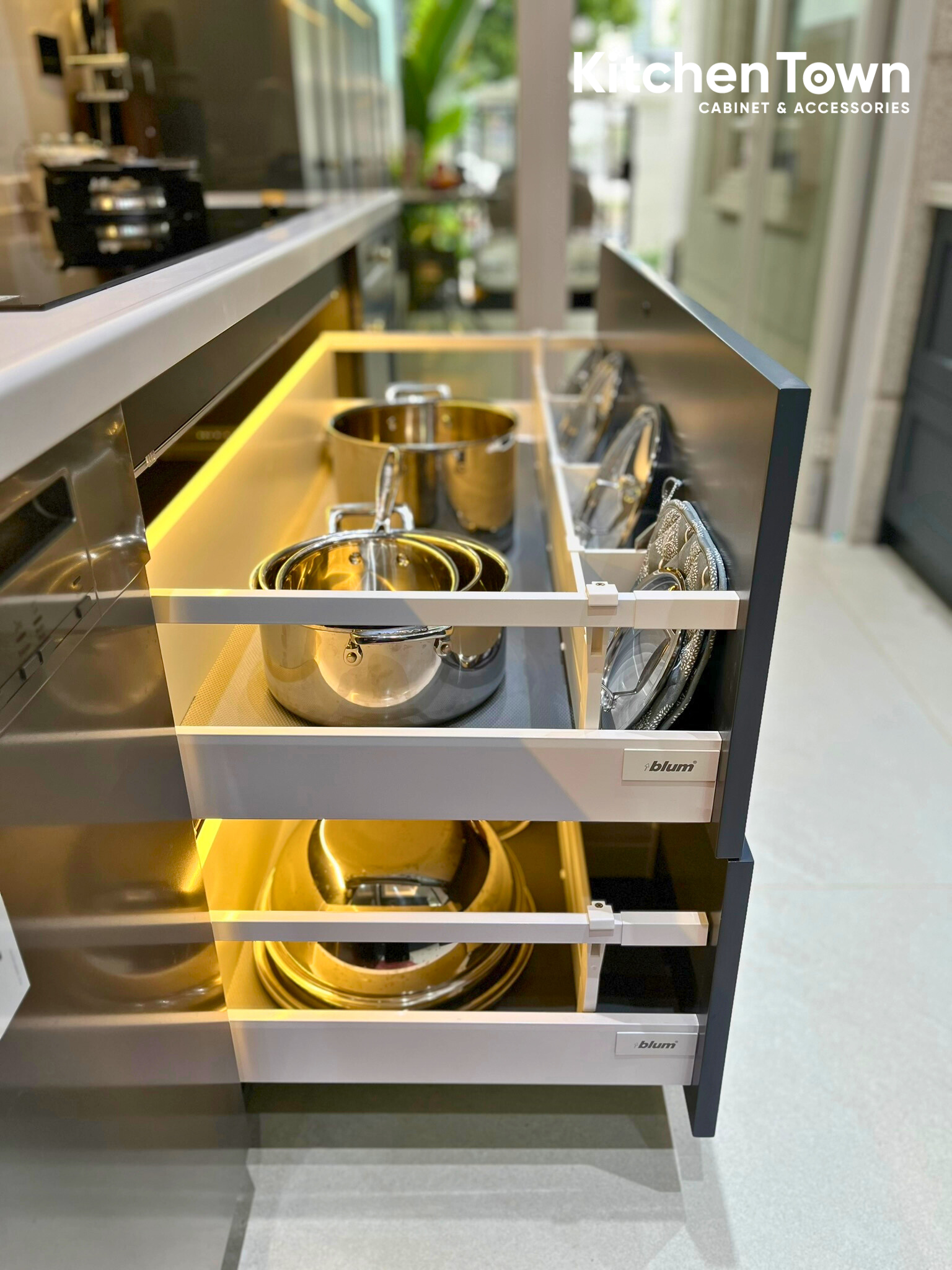 Mặt đá trắng vân mịn làm nổi bật tổng thể, hài hòa với ánh sáng. Máy hút mùi dạng chụp thiết kế đồng bộ với tủ, tạo sự liền khối tinh tế. Tủ dưới sử dụng ngăn kéo âm toàn phần Blum cao cấp, bố trí thông minh cho ly, chén, xoong nồi, đóng mở nhẹ nhàng, bền bỉ. Đèn LED hắt tủ mang lại ánh sáng ấm, tăng chiều sâu và nâng tầm thẩm mỹ cho không gian bếp.