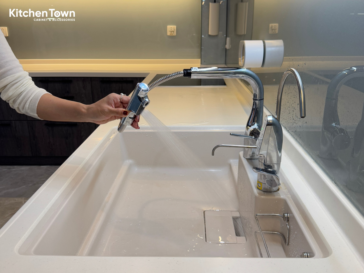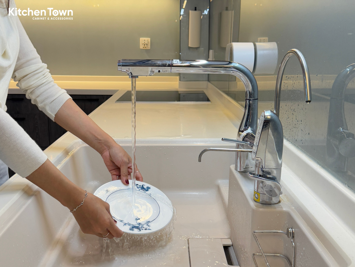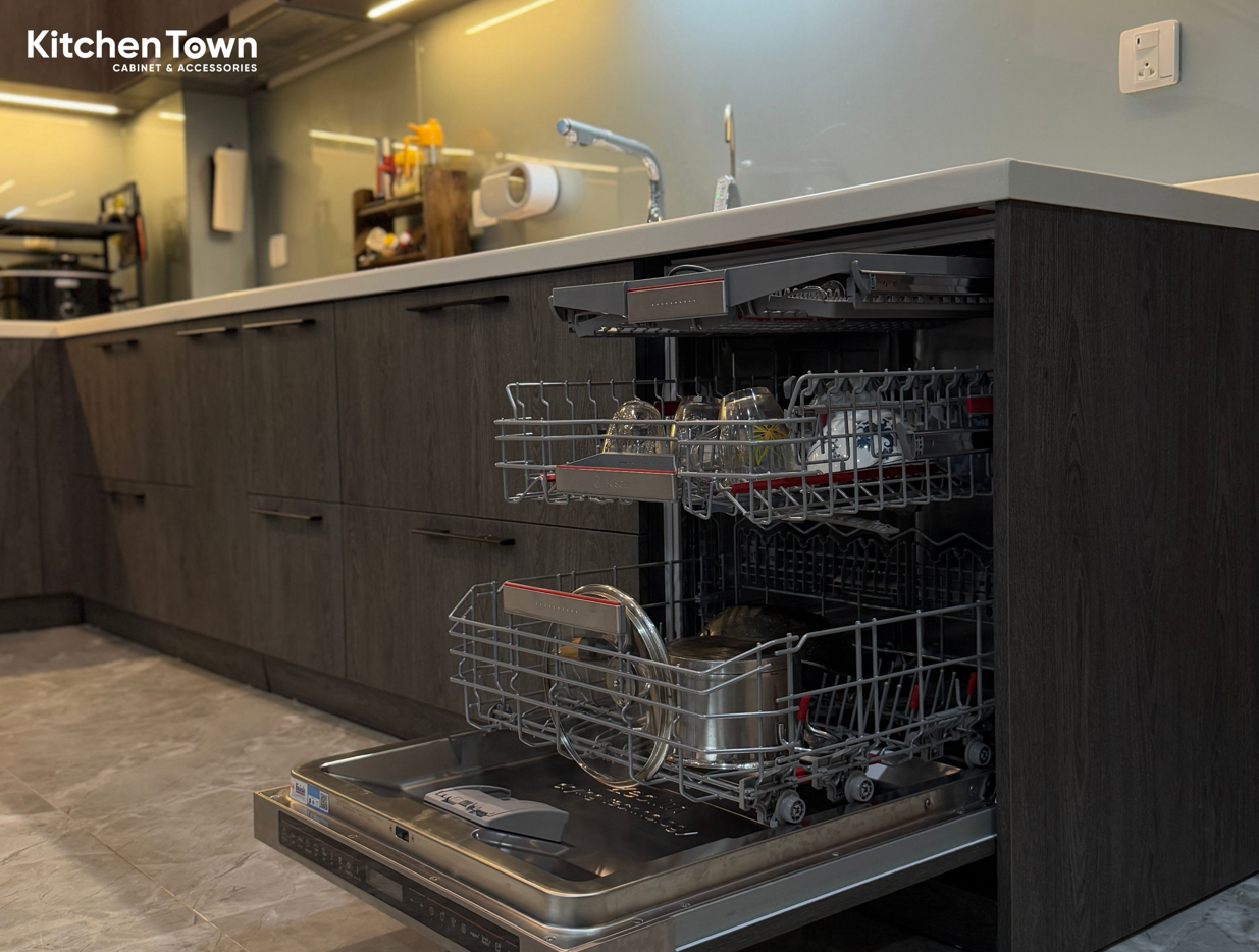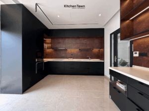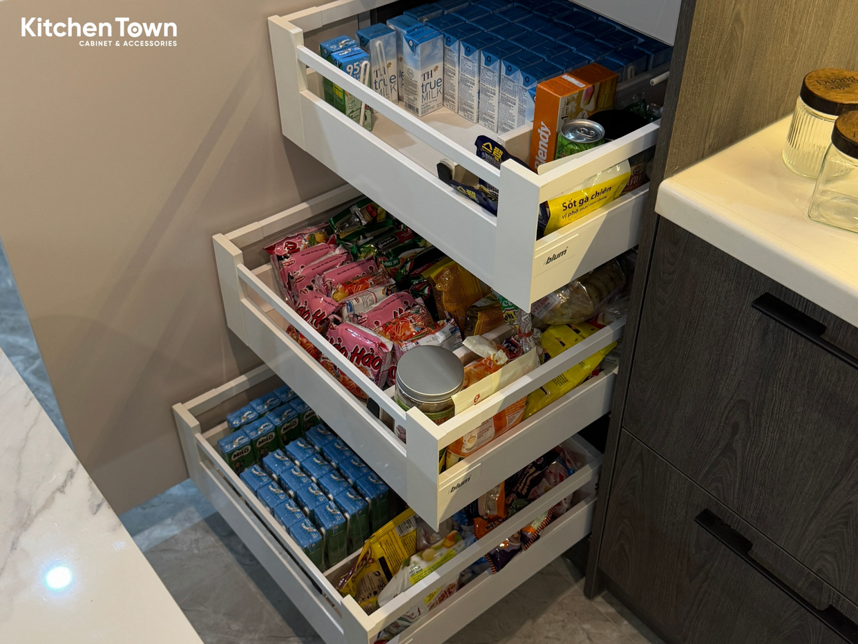 Tủ bếp chữ L do Kitchentown thiết kế và thi công mang phong cách hiện đại, tinh giản mà sang trọng. Gam màu gỗ trầm kết hợp mặt đá trắng tạo nên tổng thể hài hòa, ấm cúng. Hệ tủ trên cao kịch trần giúp tối ưu không gian lưu trữ, các chi tiết tay nắm âm mang lại sự tinh tế và liền mạch. Bố cục bếp hợp lý, kết hợp bàn ăn giữa phòng và ánh sáng đèn thả trang nhã, tạo nên không gian bếp tiện nghi, đẳng cấp và đậm chất hiện đại.