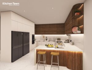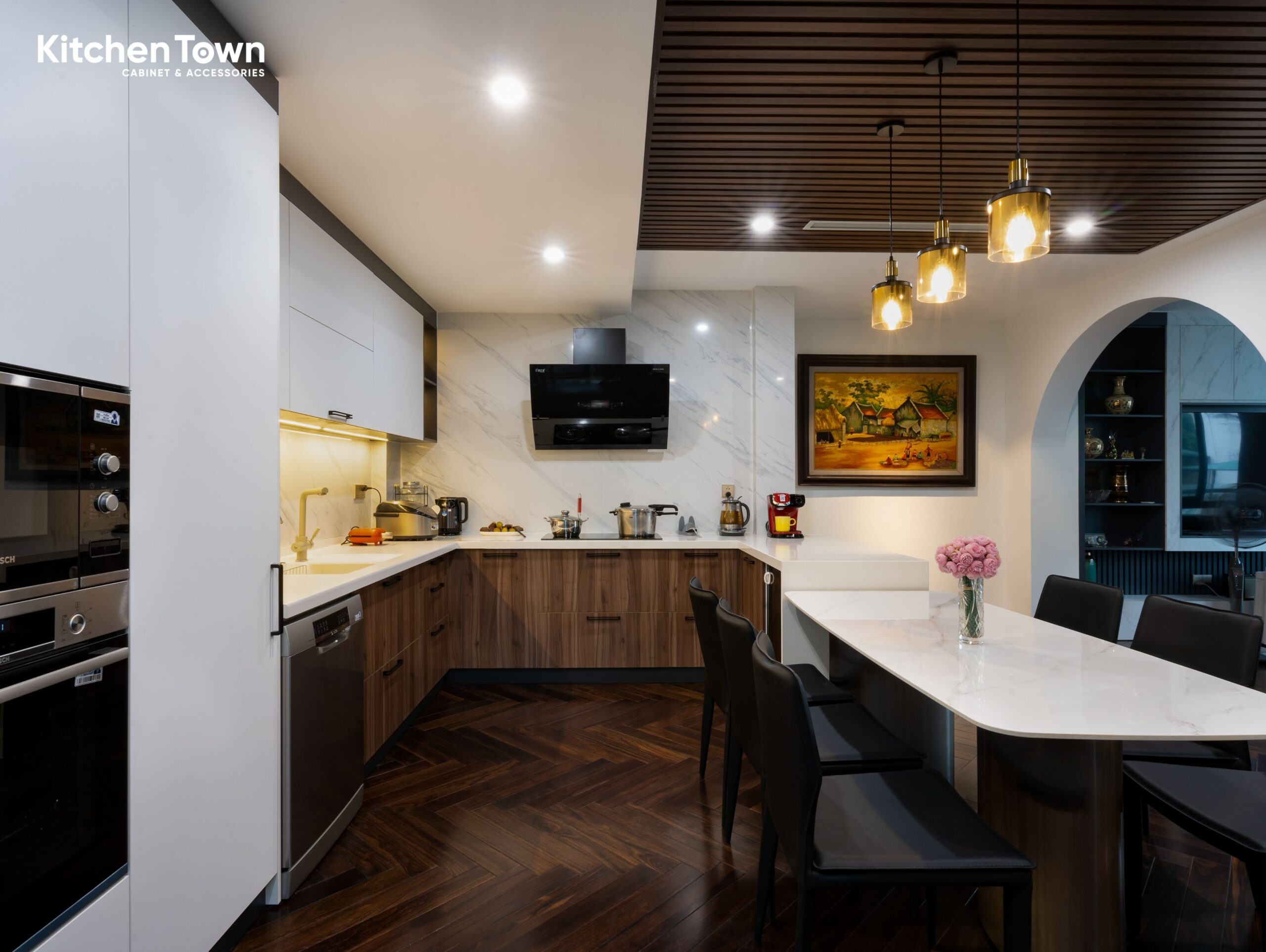 Tủ bếp chữ U có thiết kế hiện đại với sự kết hợp màu sắc trắng tinh tế và nâu gỗ ấm áp. Khu vực bếp được tối ưu với các thiết bị như bếp từ, lò nướng và máy hút mùi. Mặt bàn bằng đá sáng màu và quầy bar cùng ghế bar hiện đại tạo sự sang trọng. Các đèn chiếu sáng vàng ấm và sàn gỗ kiểu xương cá làm tăng tính thẩm mỹ. Không gian được trang trí bằng hoa và trái cây, mang đến vẻ đẹp tự nhiên và tiện nghi cho căn bếp