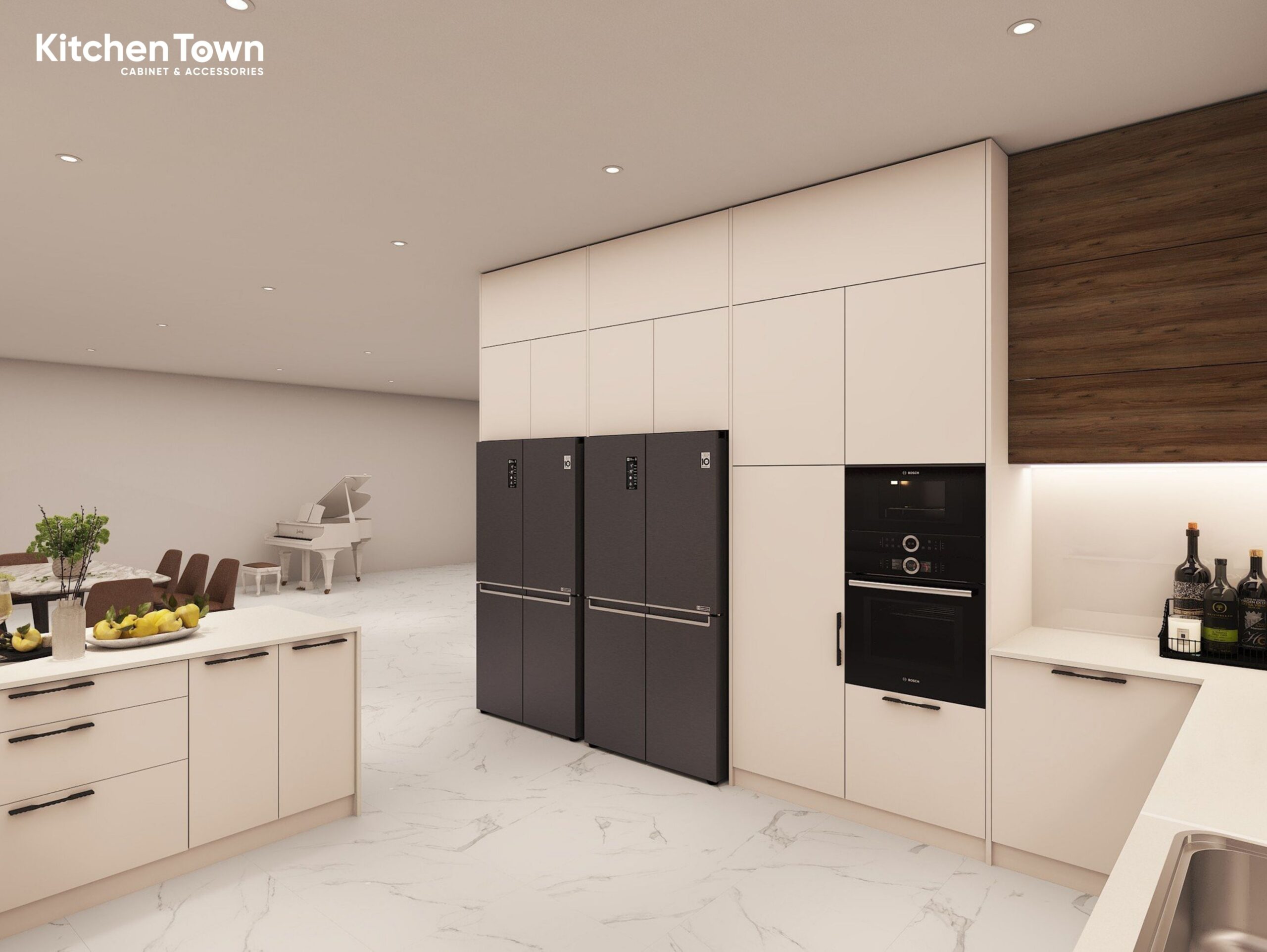 Hai tủ lạnh đôi âm tường, lò nướng và lò vi sóng âm tủ, bếp từ âm.