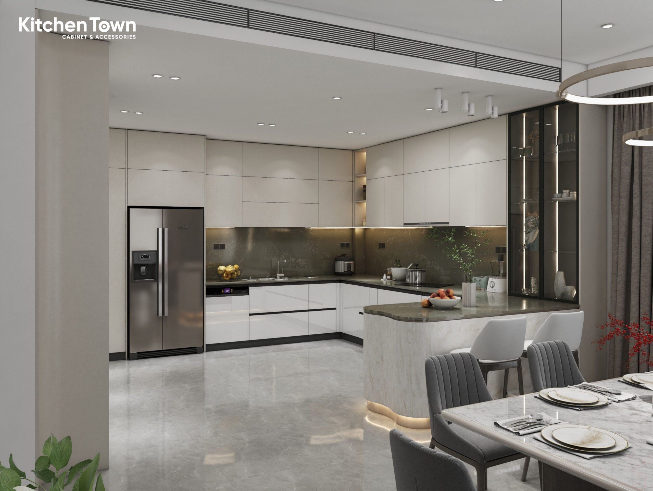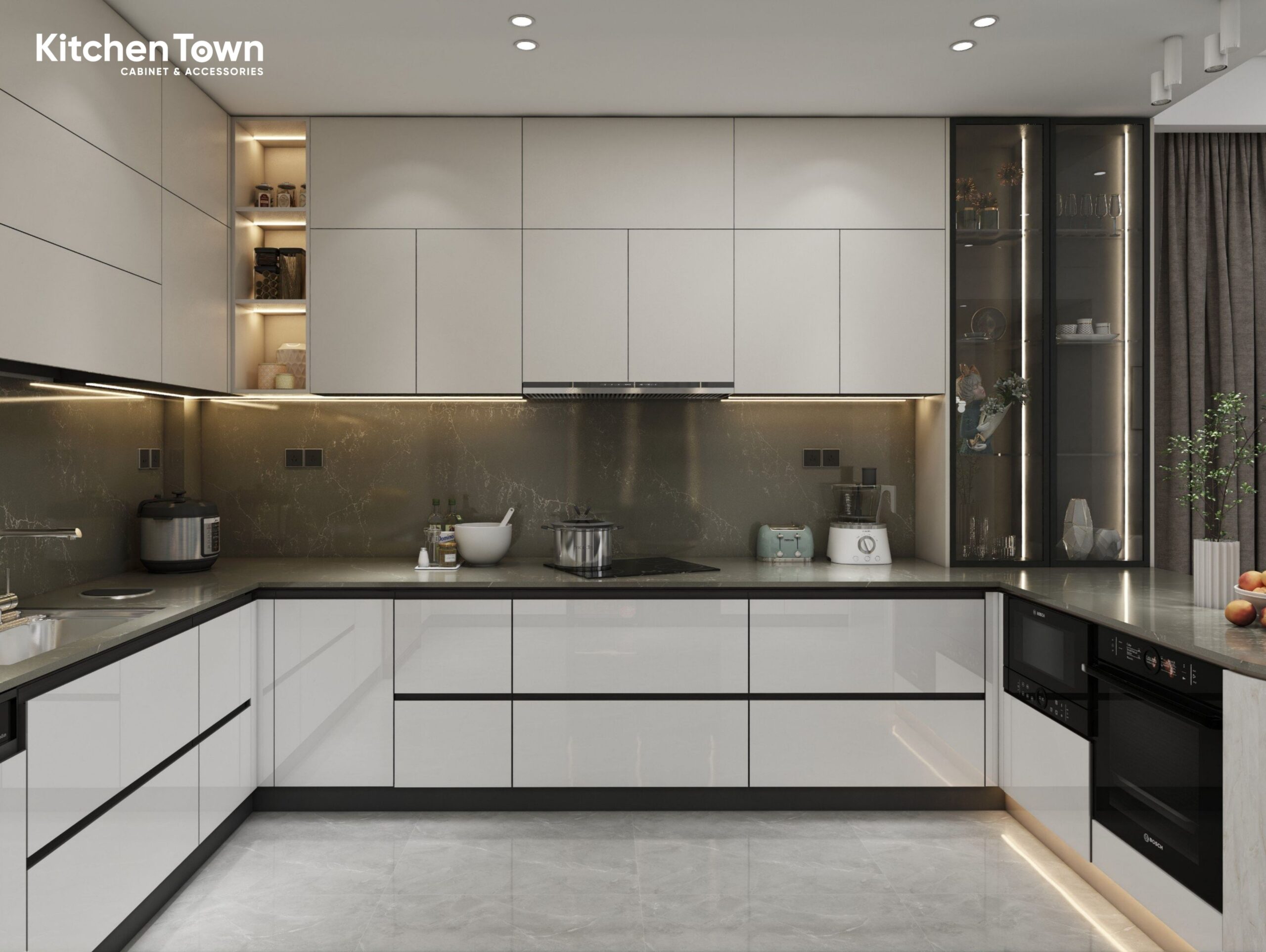 Tủ bếp chữ U trong không gian này được thiết kế theo phong cách hiện đại – tối giản, sử dụng hệ tủ phẳng bóng giúp căn bếp trở nên rộng và sáng hơn. Bố cục chữ U tạo thành ba mặt thao tác liên tục: khu vực chậu rửa – khu vực chuẩn bị – khu vực nấu, giúp người dùng di chuyển cực kỳ thuận tiện theo “tam giác bếp”.