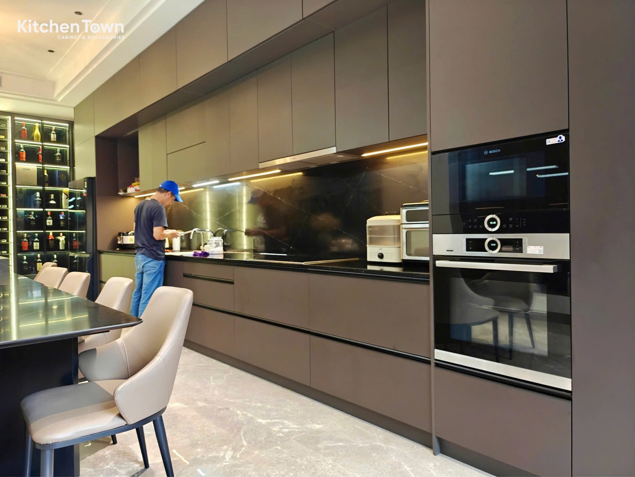 Tủ được bố trí cao kịch trần, tối ưu công năng lưu trữ, cùng hệ phụ kiện thông minh và thiết bị âm tường đồng bộ, mang lại không gian bếp gọn gàng, tinh tế và đẳng cấp chuẩn châu Âu.